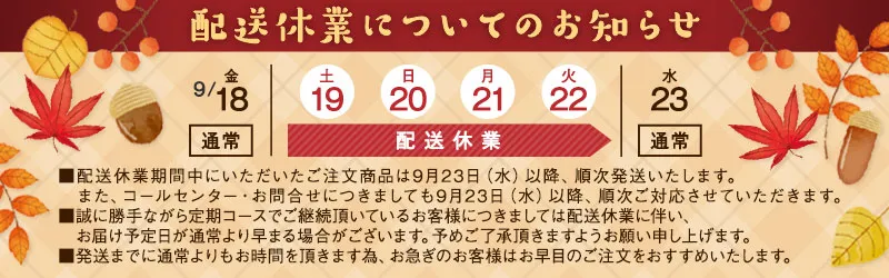 【配送休業日】 令和2年9月19日(土)~令和2年9月22日(火)
