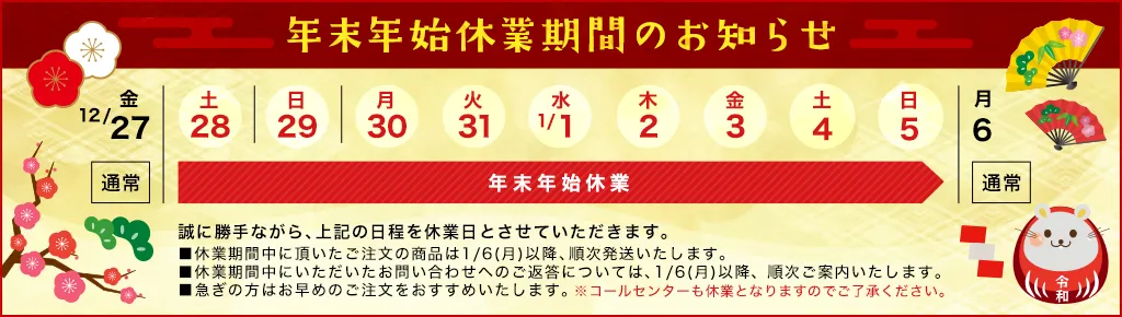 ・休業期間中に頂いた商品のご発送、お問い合わせへのご返答は1月6日以降、順次ご案内させて頂きます。